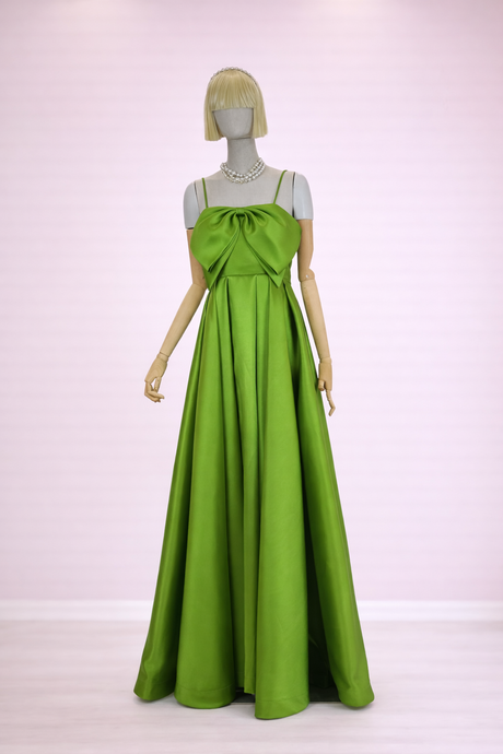 Robe longue vert intense à la silhouette épurée, sublimée par un bustier drapé en forme de nœud et une jupe ample au tombé majestueux. Une pièce lumineuse et élégante.