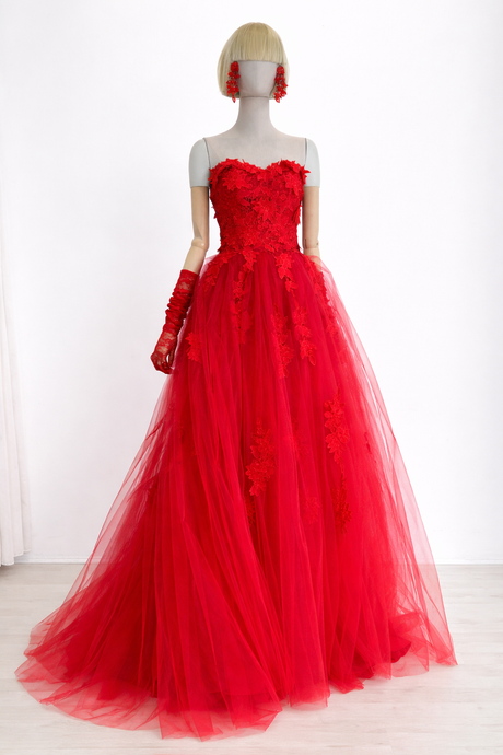 Robe de bal rouge éclatante en tulle, à la silhouette aérienne et romantique. Son bustier cœur délicatement orné d’applications florales se prolonge sur une jupe ample et vaporeuse, pour une allure intense et précieuse.