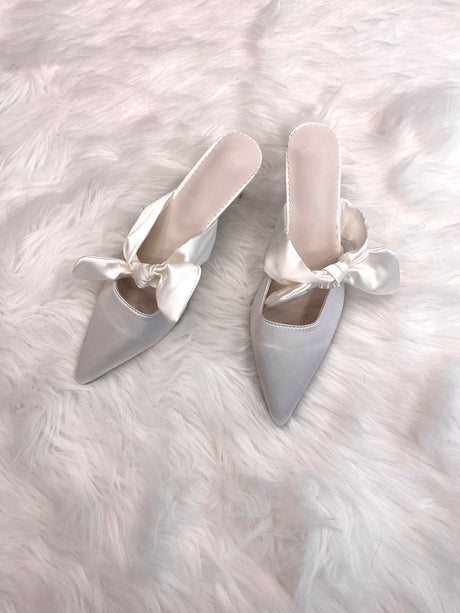Mules ivoire à bout pointu, sublimées par un large nœud satiné qui apporte une touche délicate et féminine. Une paire élégante et raffinée, parfaite pour compléter une silhouette de cérémonie ou de soirée.