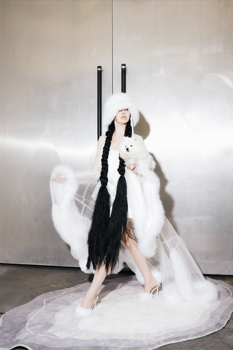 Crafted from lightweight sheer tulle and trimmed with luxurious white faux fur, it blends ethereal movement with soft, sculptural volume.