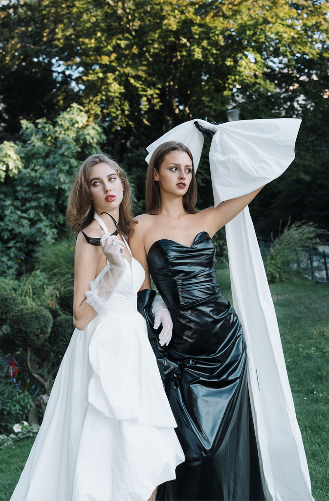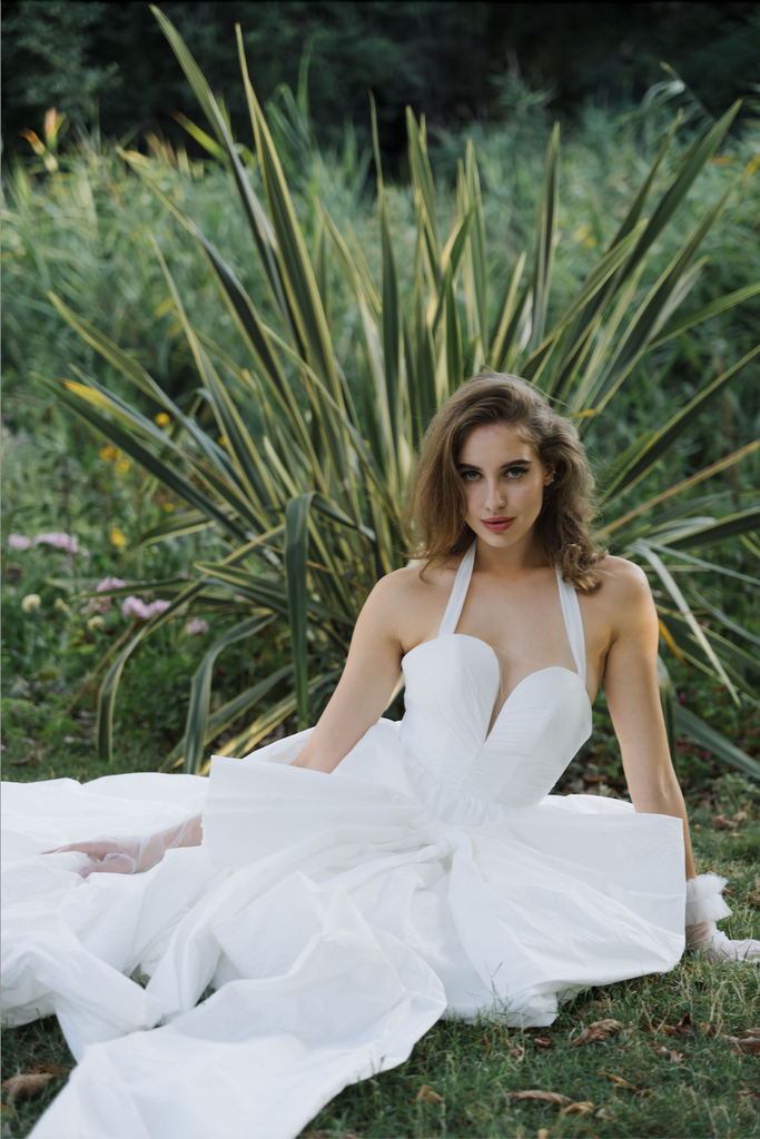 Son bustier délicatement structuré sublime la silhouette, tandis que la jupe fluide et asymétrique apporte mouvement et légèreté.