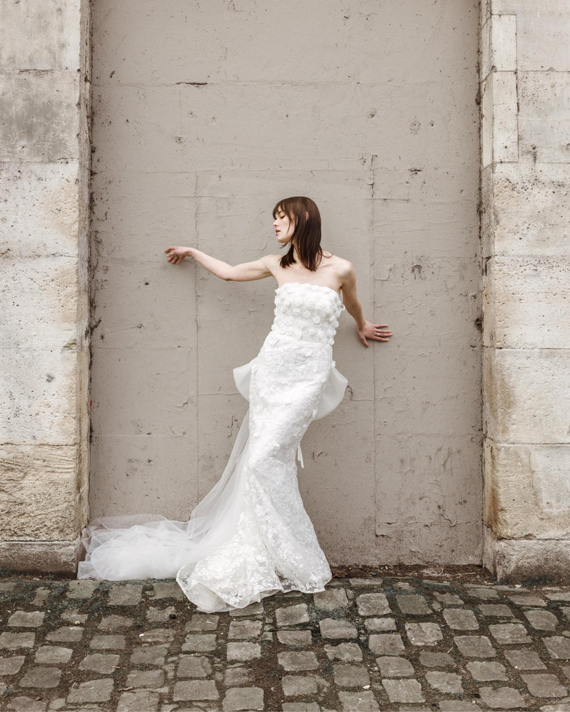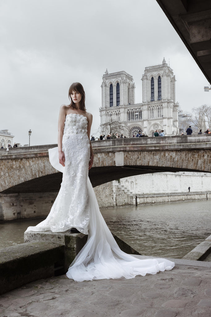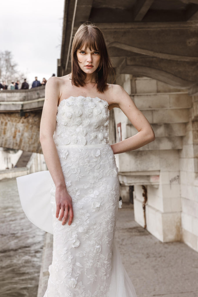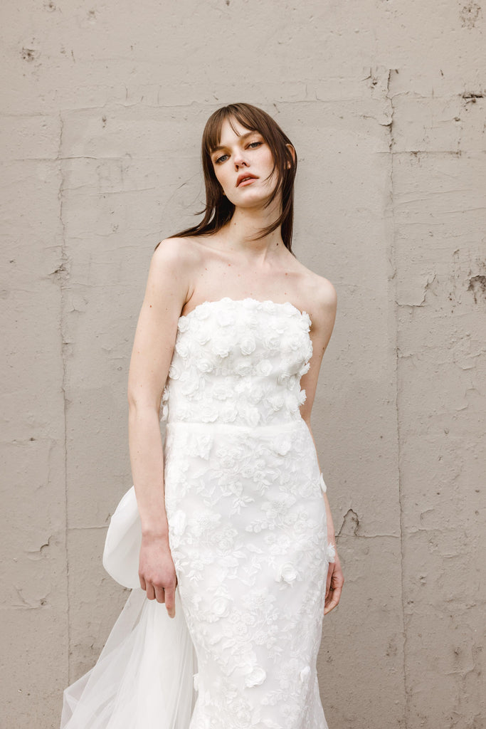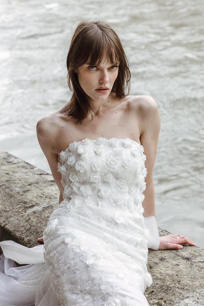 Intricate floral appliqués seem to bloom directly from the skin, creating a mirrored garden that reflects the bride’s inner light. The strapless neckline and gentle train offer a timeless elegance, while the handcrafted details bring a couture soul to every step.