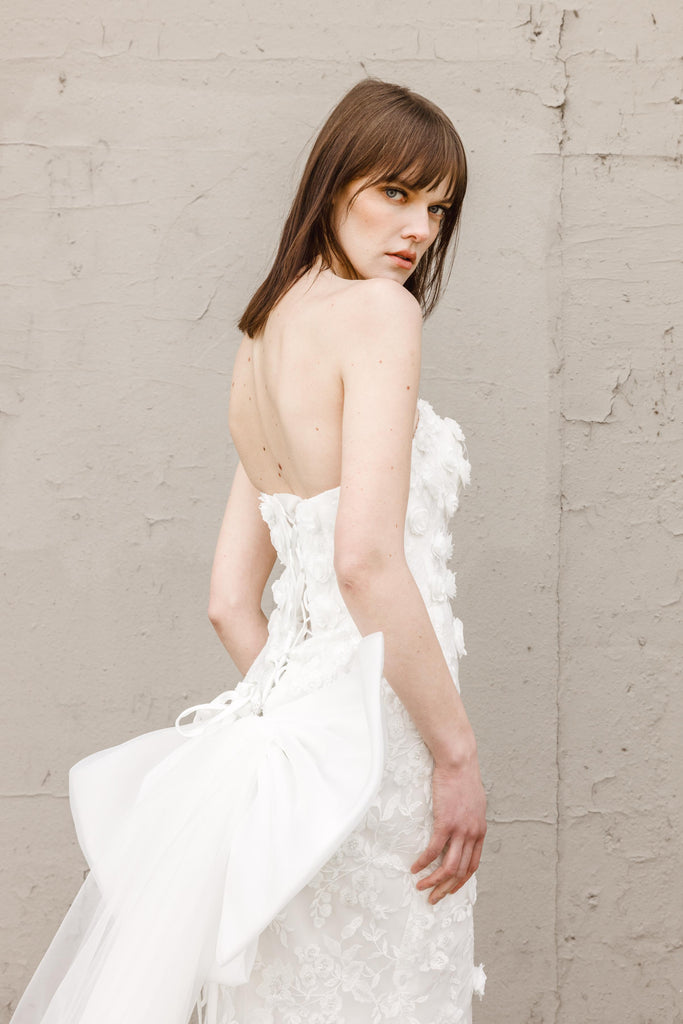 A gown born from light and grace, Mireva captures the essence of modern romance in every detail. With a silhouette that hugs the form and blossoms into delicate floral textures, this design evokes both softness and strength.